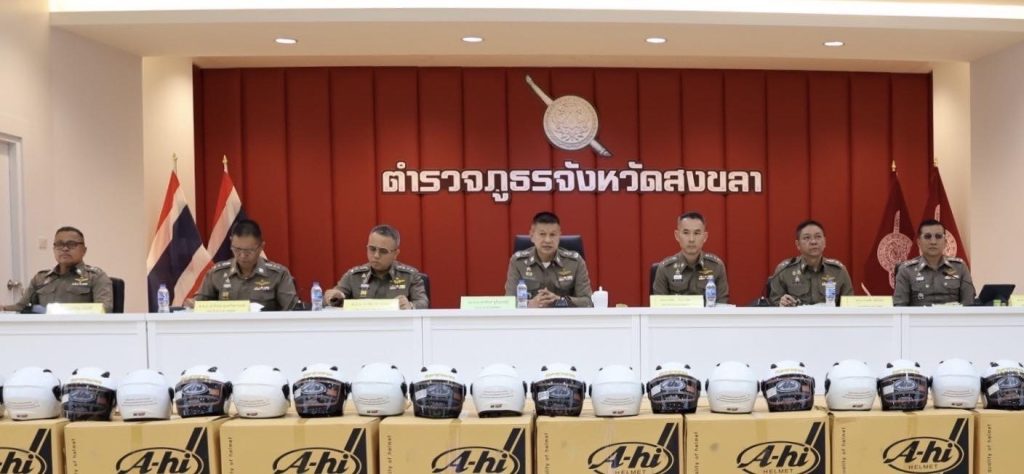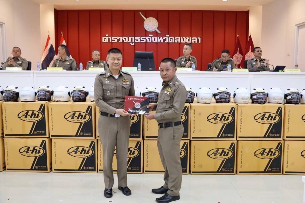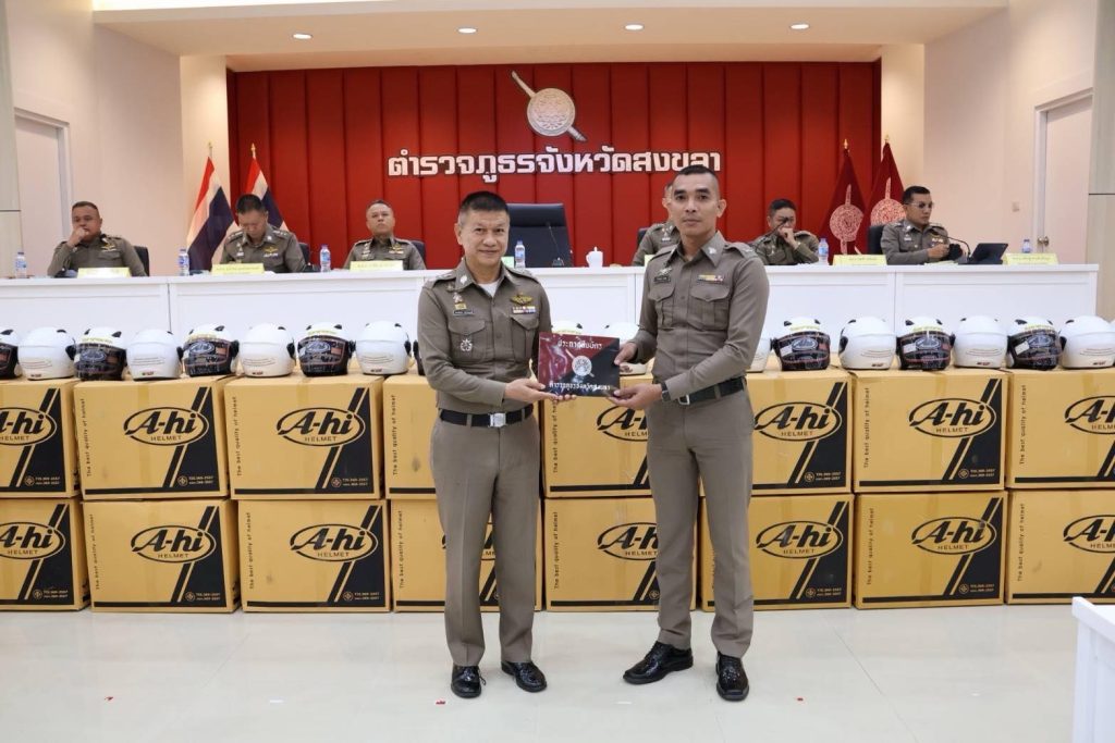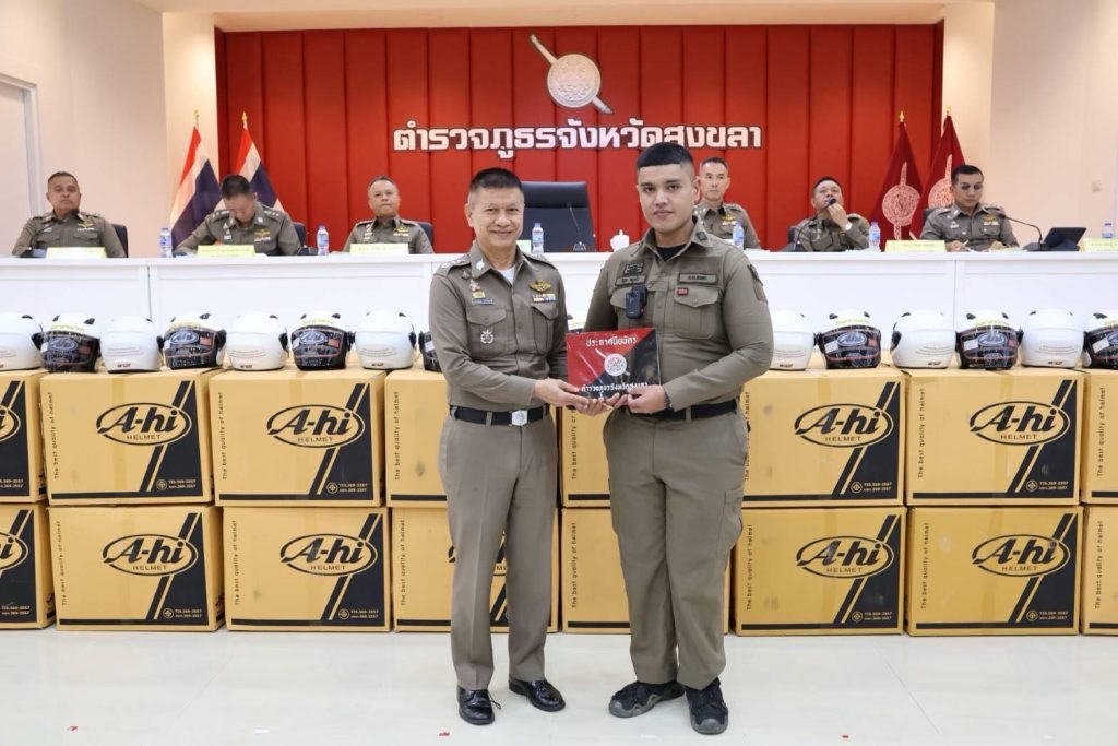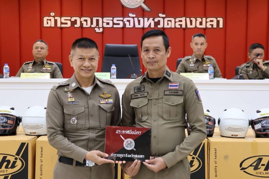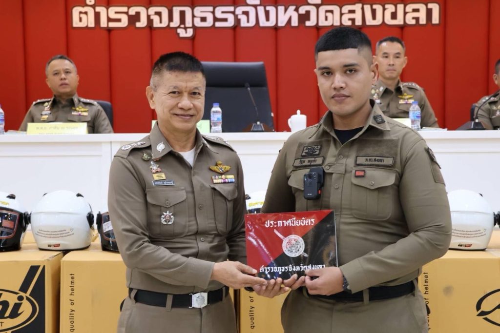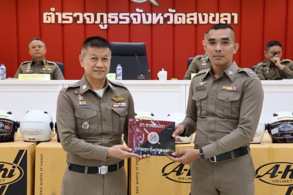 ..พร้อมมอบประกาศเกียรติคุณให้แก่ข้าราชการตำรวจปฏิบัติหน้าที่ดีเด่น และ มอบหมวกกันน็อคแก่ทุกสภ.เพื่อนำไปแจกจ่ายประชาชนในพื้นที่ ณ ห้องประชุมสมิหลา ศปก.ภ.จว.สงขลา