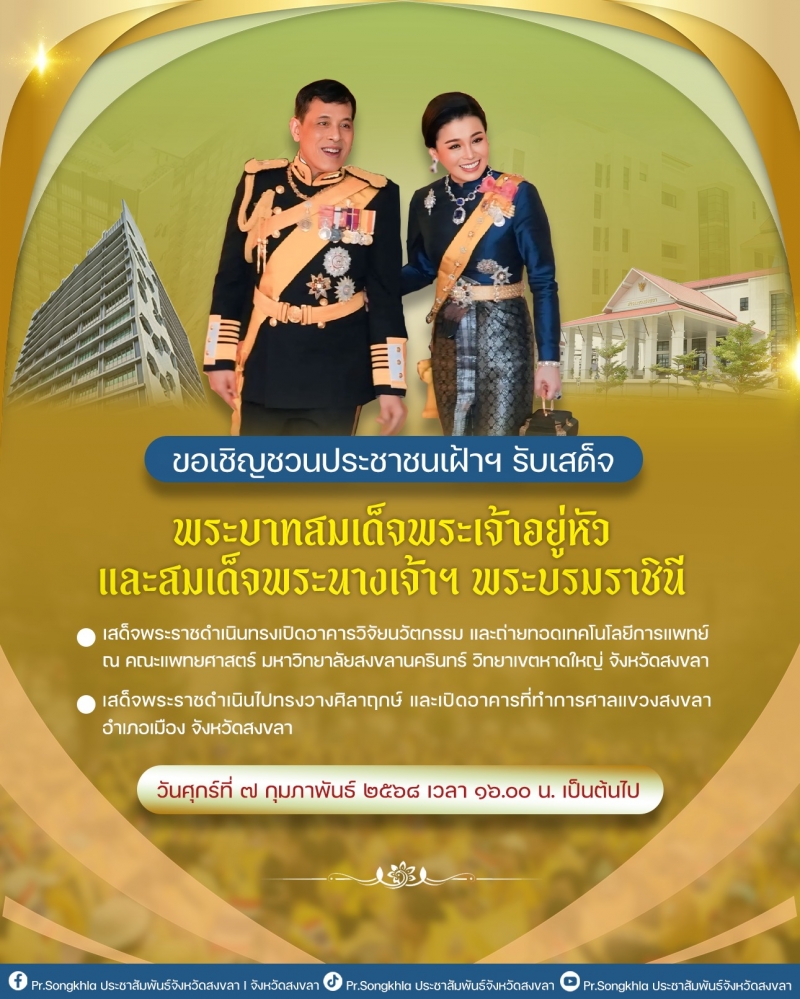 ด้วยพระบาทสมเด็จพระเจ้าอยู่หัวและสมเด็จพระนางเจ้าฯ พระบรมราชินี มีกำหนดการเสด็จพระราชดำเนินมาทรงเปิดอาคารวิจัย นวัตกรรม และถ่ายทอดเทคโนโลยีการแพทย์ ณ คณะแพทยศาสตร์ มหาวิทยาลัยสงขลานครินทร์ วิทยาเขตหาดใหญ่ อำเภอหาดใหญ่ จังหวัดสงขลา และเสด็จพระราชดำเนินมาไปทรงวางศิลาฤกษ์และเปิดอาคารที่ทำการศาลแขวงสงขลา อำเภอเมือง จังหวัดสงขลา ในวันศุกร์ที่ 7 กุมภาพันธ์ 2568